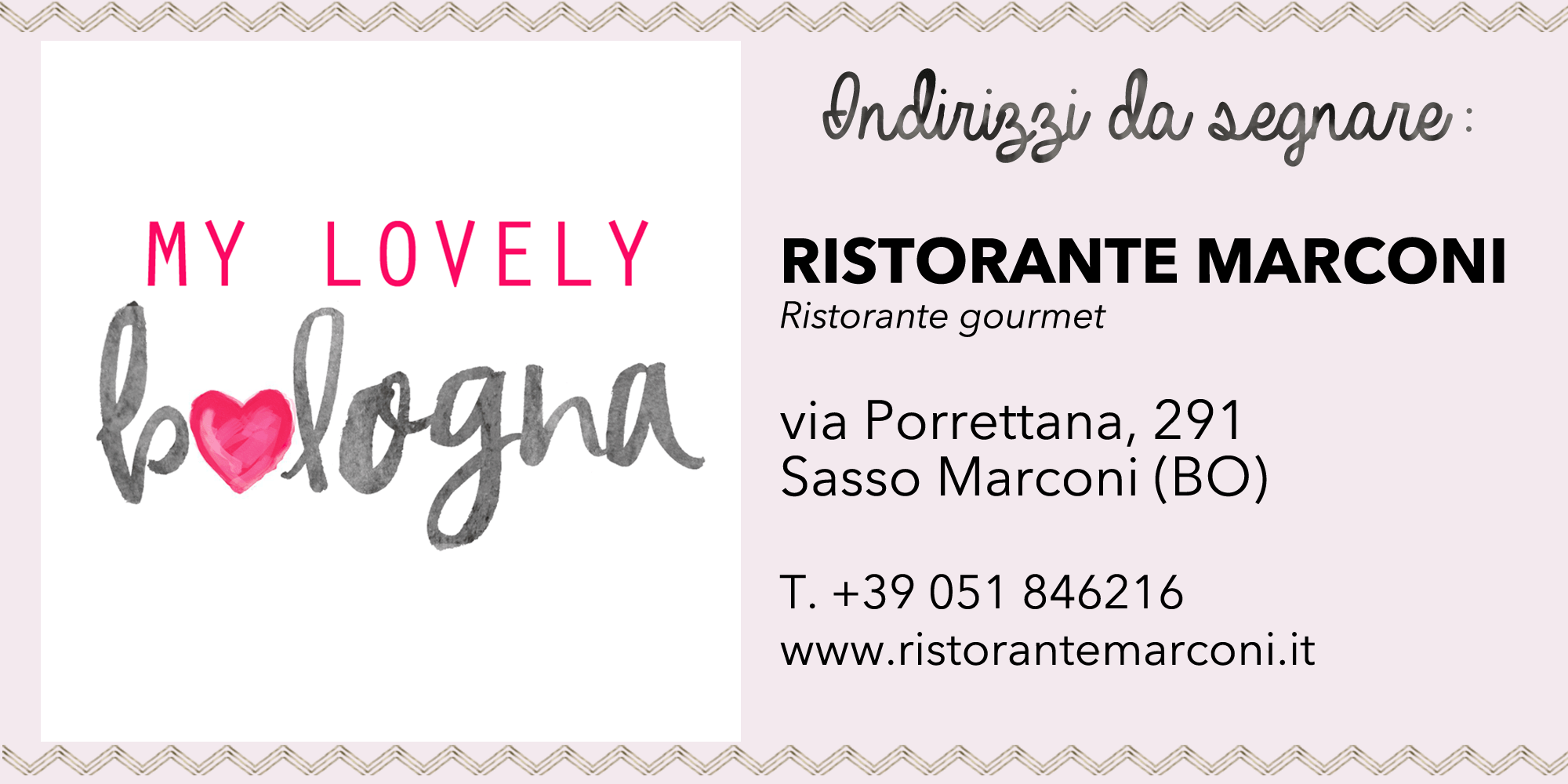 Su questa via si raggiunge presto Sasso Marconi, uno dei primi paesi dell’Appennino bolognese che sanno già di un pochino di montagna… Poco dopo il Museo Marconi (da visitare) lungo la strada sulla sinistra appare l’insegna del Ristorante Marconi, casa della chef con una stella Michelin Aurora Mazzucchelli.